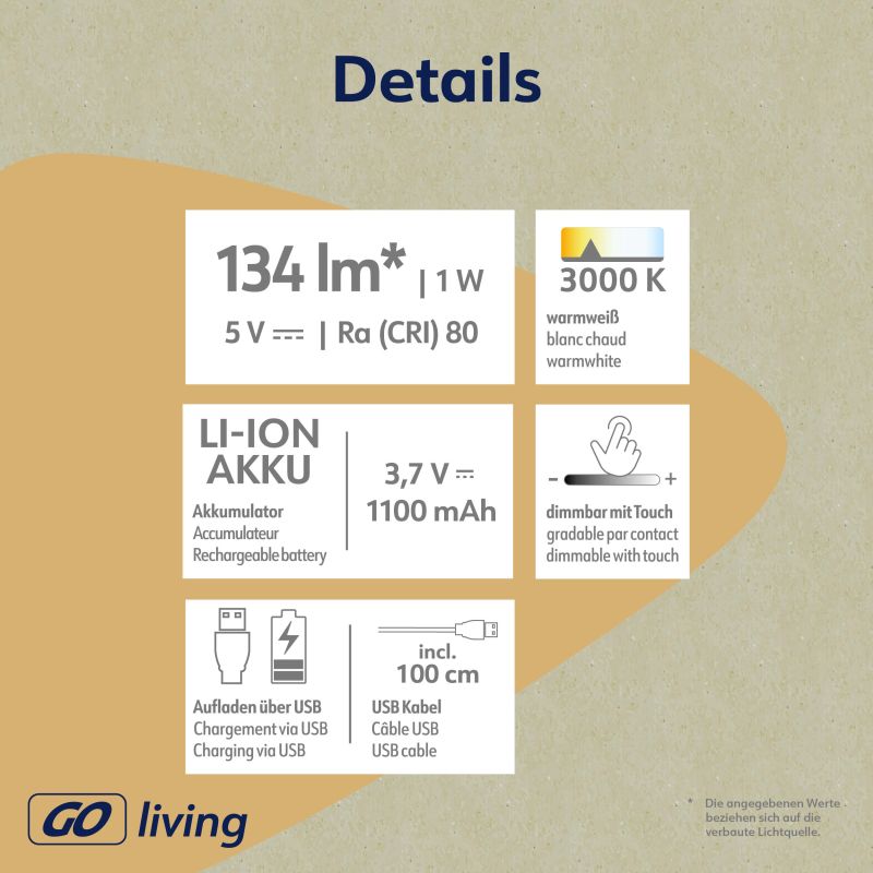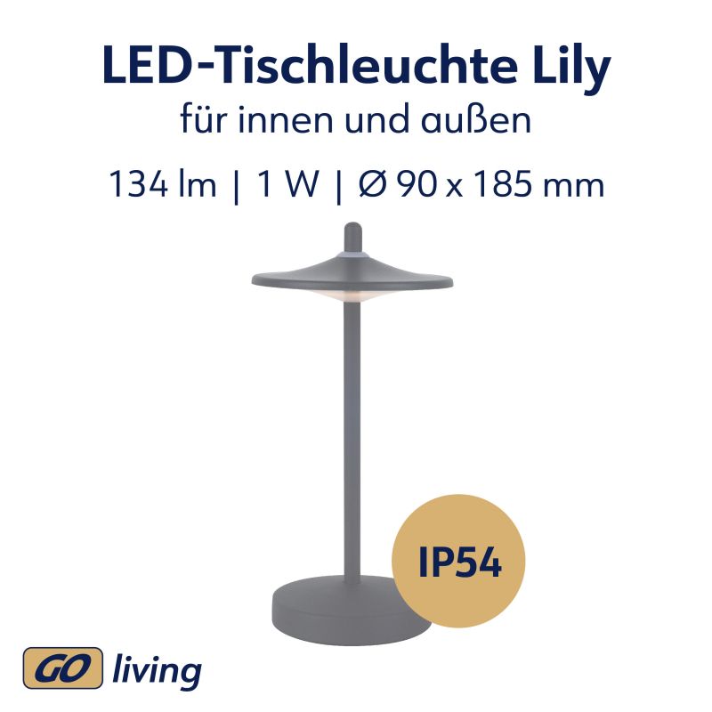 Entdecken Sie die stilvolle und praktische MÜLLER-LICHT GO living LED-Tischleuchte Lily Gray – die ideale Beleuchtung für Ihr Zuhause und den Außenbereich! Dank des integrierten Akkus können Sie die Leuchte überall flexibel platzieren, ganz ohne störende Kabel. Ob auf dem Balkon, im Garten oder im Wohnbereich – Lily Gray sorgt mit ihrem warmweißen Licht (3000 K) für eine behagliche Atmosphäre. Über den praktischen Touch-Schalter lässt sich die Helligkeit stufenlos dimmen, sodass Sie die Lichtstimmung perfekt an Ihre Bedürfnisse anpassen können. Die Leuchte ist durch die Schutzklasse IP54 wasser- und staubgeschützt und somit optimal für den Außenbereich geeignet. Die Leuchte lässt sich bequem über den USB-C-Anschluss aufladen. Durch ihre niedrige Höhe und ihr modernes Design fügt sie sich harmonisch in jede Umgebung ein und ist ein stilvoller Begleiter für gemütliche Stunden.